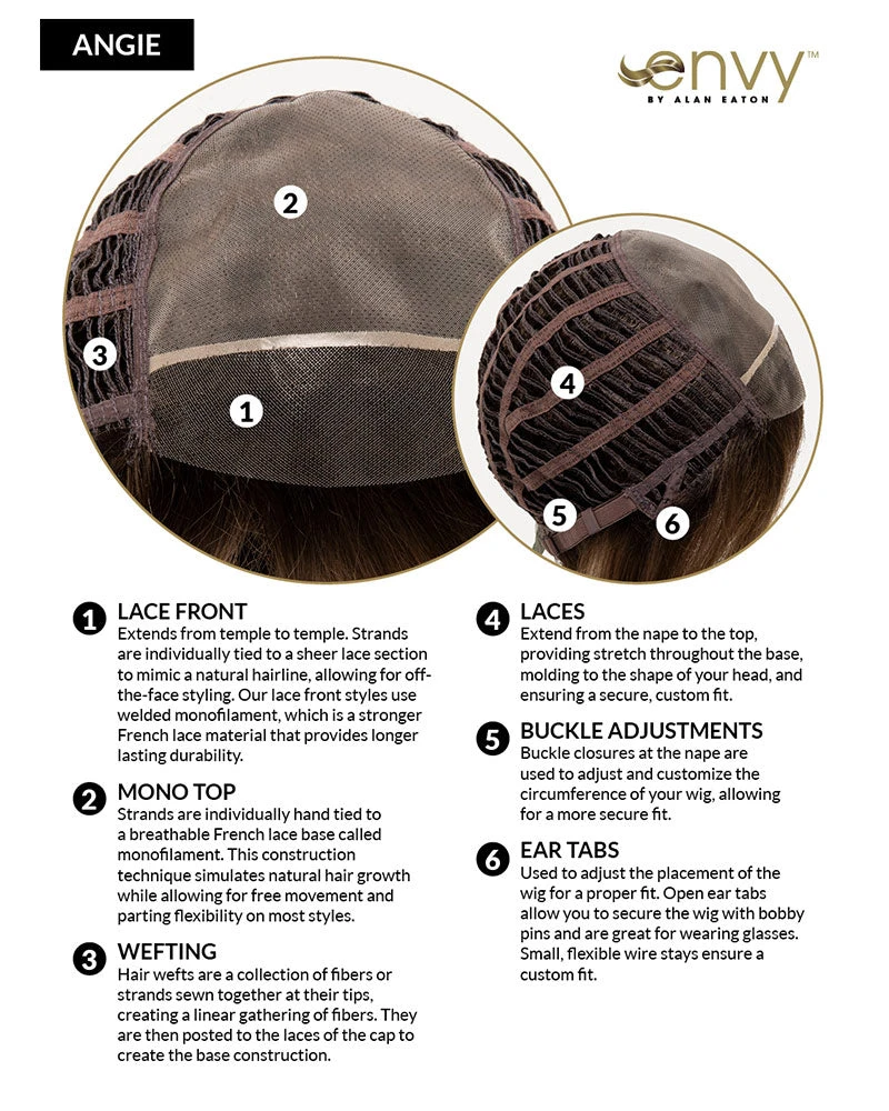 Angie by Envy takes fashion to the edge in this fashion forward style. Textured layers and razored edges give this signature look a cutting edge design. Flipped layers adorn the back of this style while razored layers create this face framing design. Lace front technology and mono top construction add a level of confidence to this undetectable finished product.