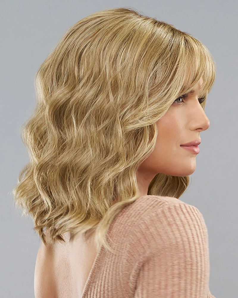 Introducing Maeve, a chic mid-length wig with beachy waves that exude simple yet sophisticated style. This wig features stylish bangs and high heat fiber for versatile styling. The low Perma tease ensures a natural, lifelike appearance, making Maeve your go-to for breezy elegance straight out of the salon.