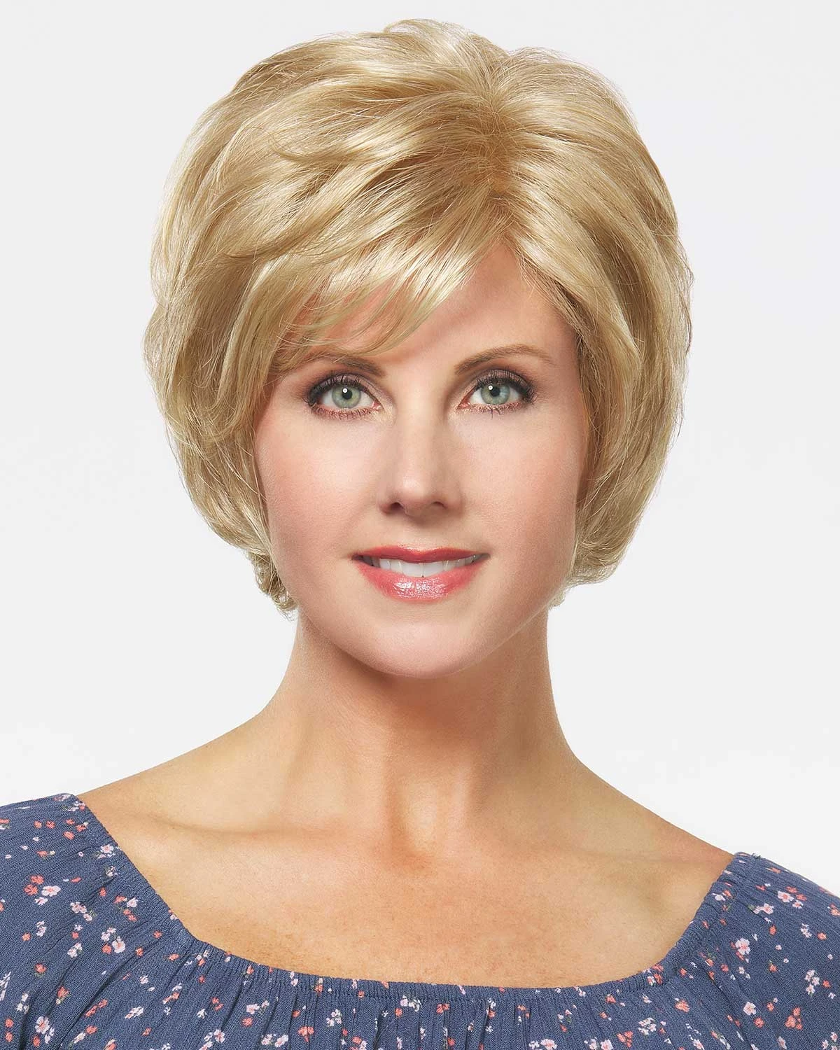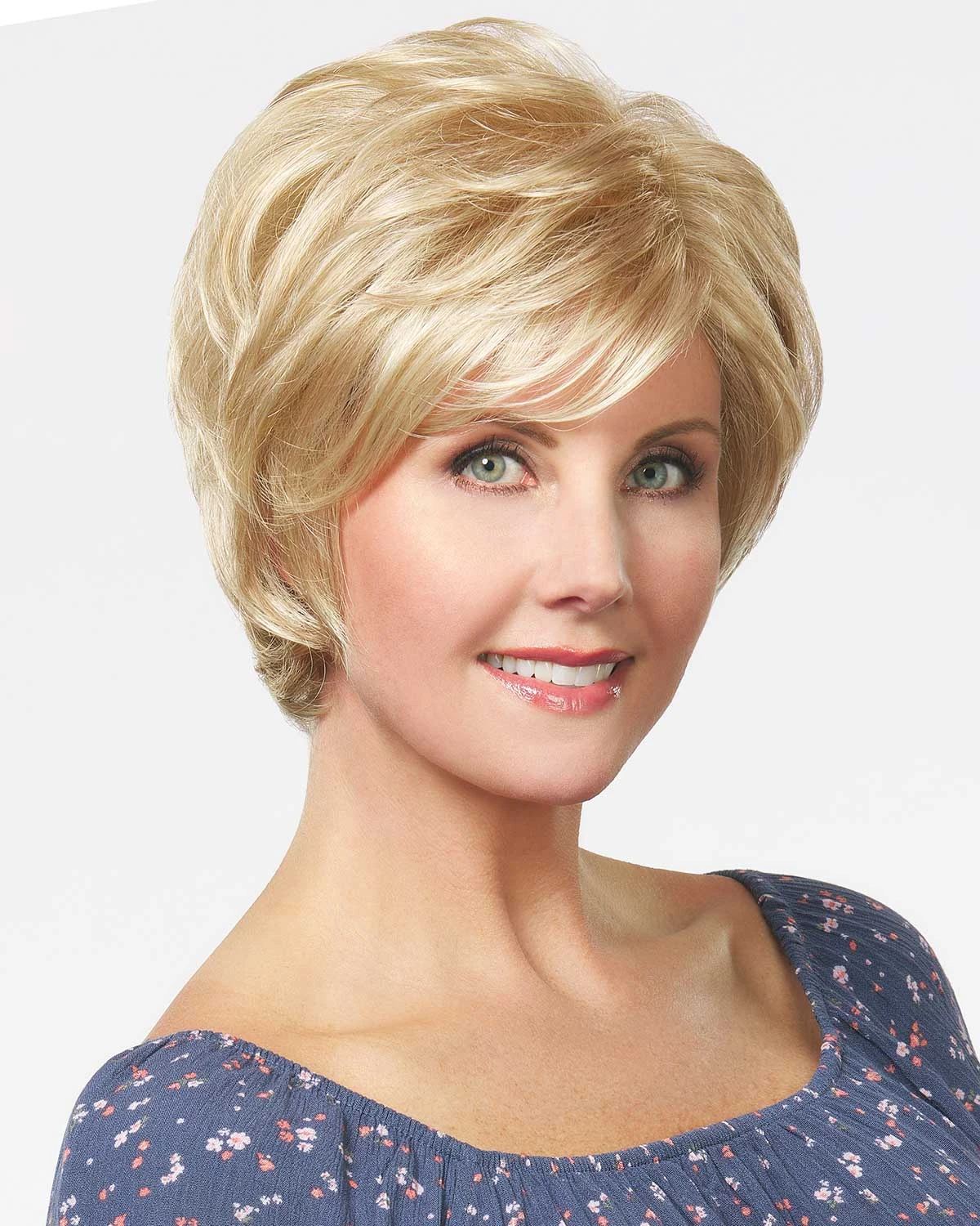 Renee, offers subtle curls, layers, and sassy volume when styled up. Renee features a monofilament top with a lace front. Brush flat, if desired, for a more refined and sophisticated look!