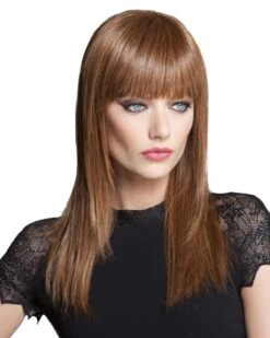 Sleek precision-cut layers fall below the shoulder with feathery blunt cut bangs. Circular knotting, a monofilament mesh crown, and our Cool Comfort Stretch back top off this extraordinarily light, natural-looking stunning style. Made from TressAllure’s own synthetic Style-Able Effortless Fiber developed to match the same thickness and weight as fine, Human Hair.