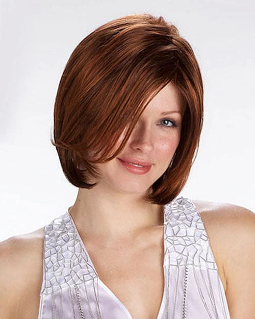 Chin length bob with elongated bangs, angled sides and a beveled nape.